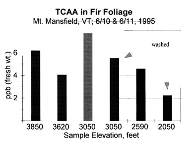Investigate hypothesis that chloroacetic acids may be involved in forest decline by attempting to replicate findings from Europe of high levels of trichloroacetic in conifer foliage.