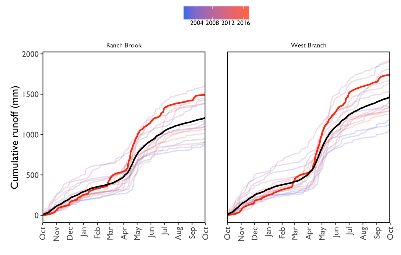 The most notable aspect of WY17 at both sites was the greater cumulative runoff compared to the long-term record. Between October and Feburary of WY17, the area experienced above-average temperatures, followed by slightly below-average temperatures from March to August, with some extreme warm tempreatures experienced in September (Northeast Regional Climate Center, link in additional resources).